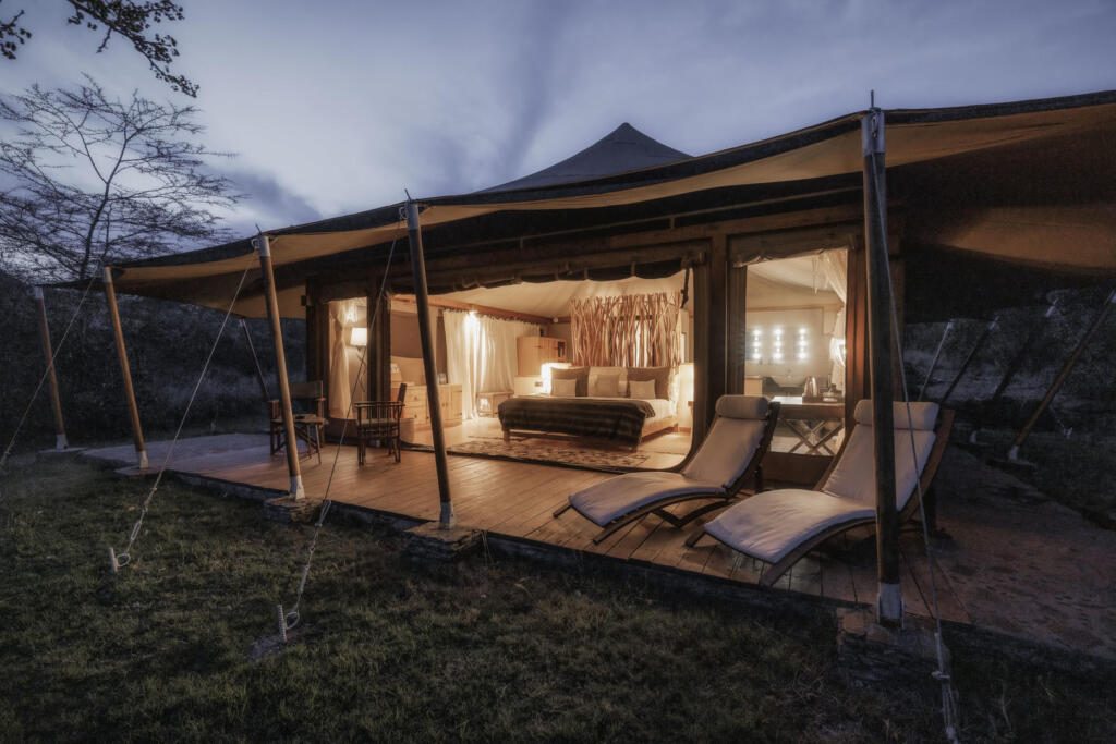 Designed in classic safari style with contemporary European influences, the camp offers spacious tented suites with floor-to-ceiling glass doors and windows that frame sweeping plateau views. Interiors feature polished wood floors, wide verandas, comfortable sitting areas and generous ensuite bathrooms with double vanities and solar-heated rainfall showers.